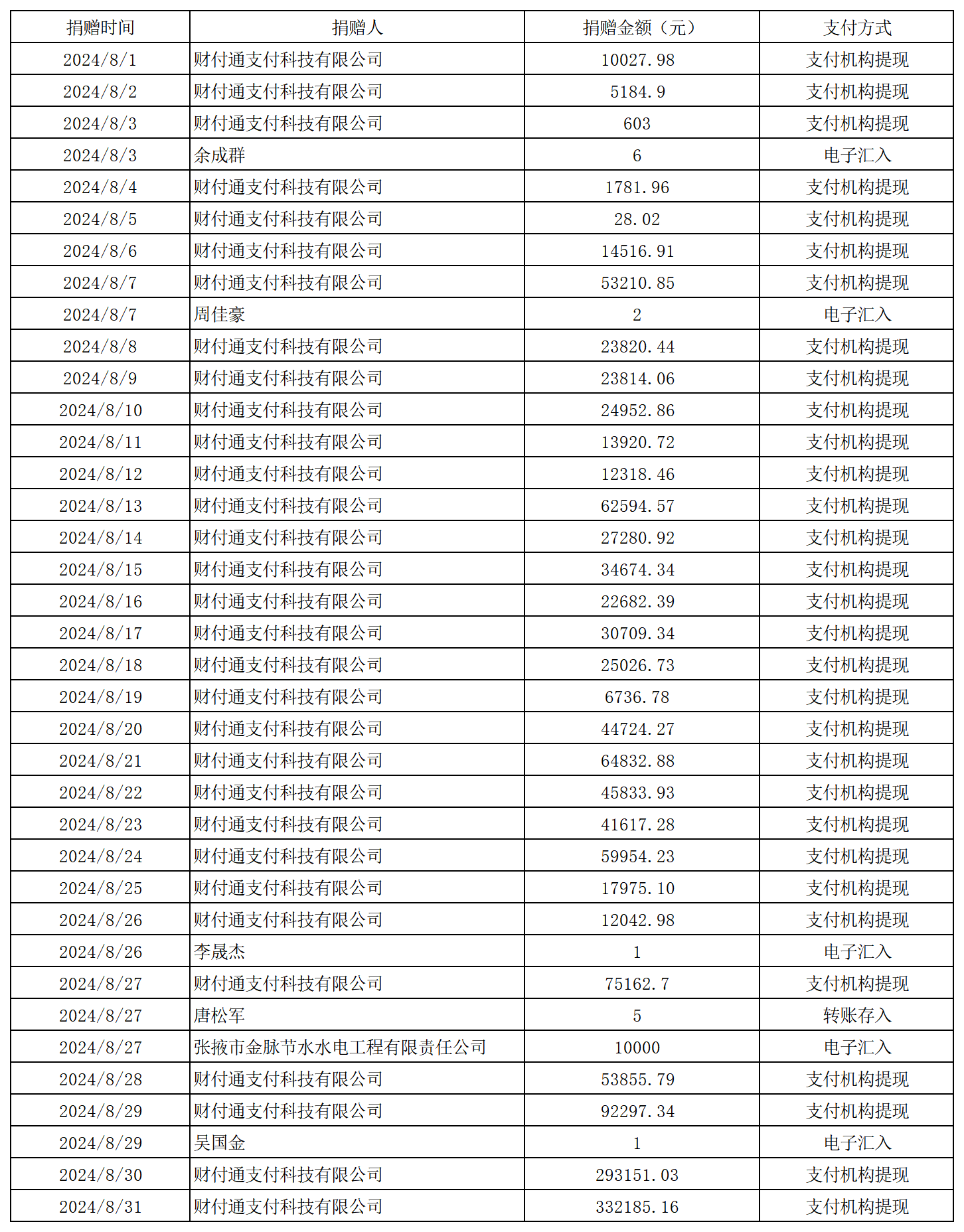 2024年張掖市慈善協(xié)會積極搭建愛心平臺,得到廣大愛心人士和愛心單位積極響應,踴躍捐款捐物,現(xiàn)將(2024年8月1日--8月31日)接收到的銀行轉賬收入公示如下: